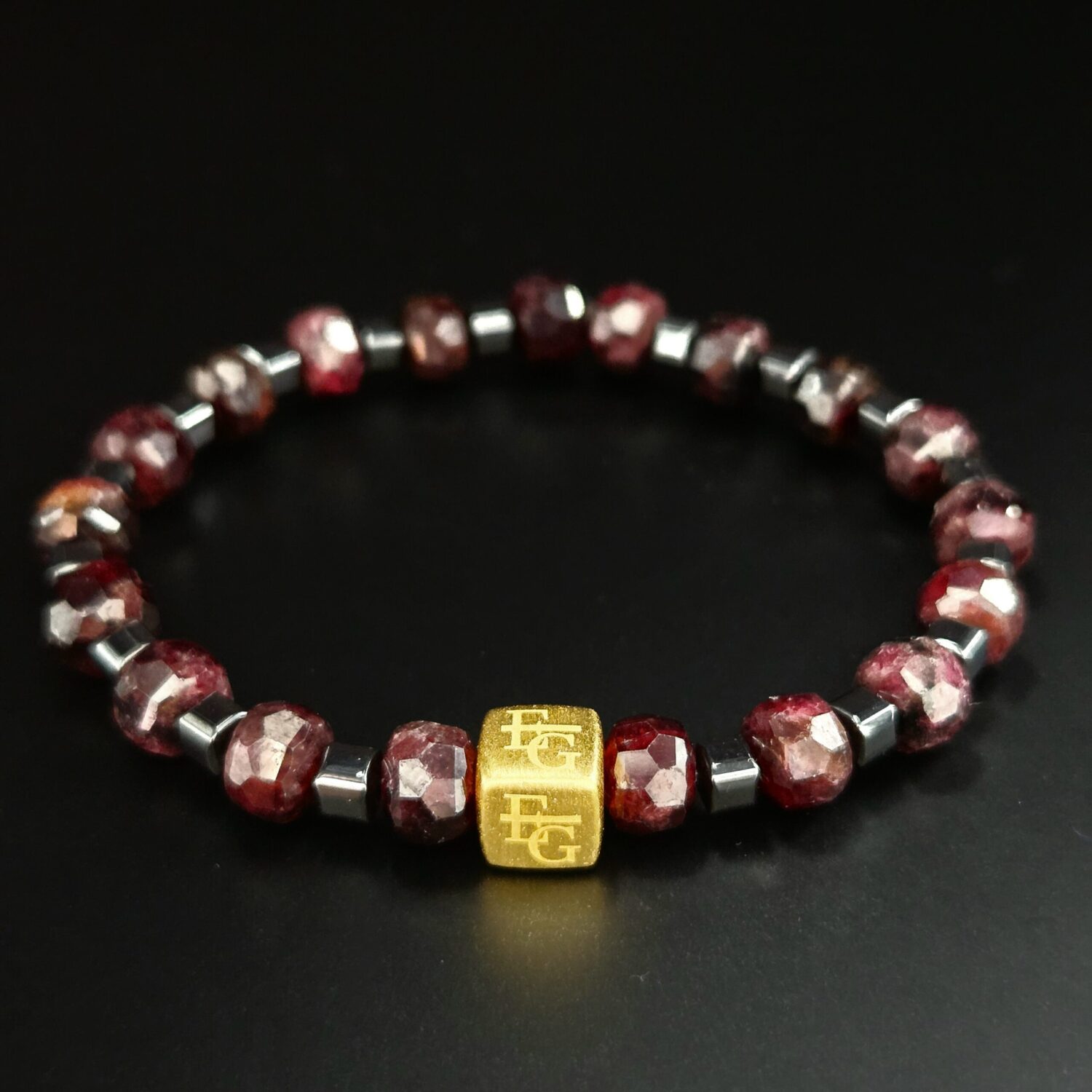 Roma is compact en luxe: donker granaat in facet, afgewerkt met een s925 gold plated logo blok.