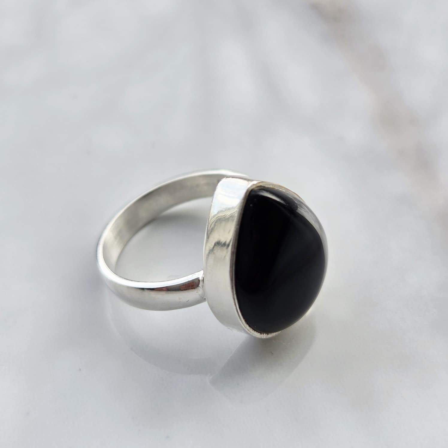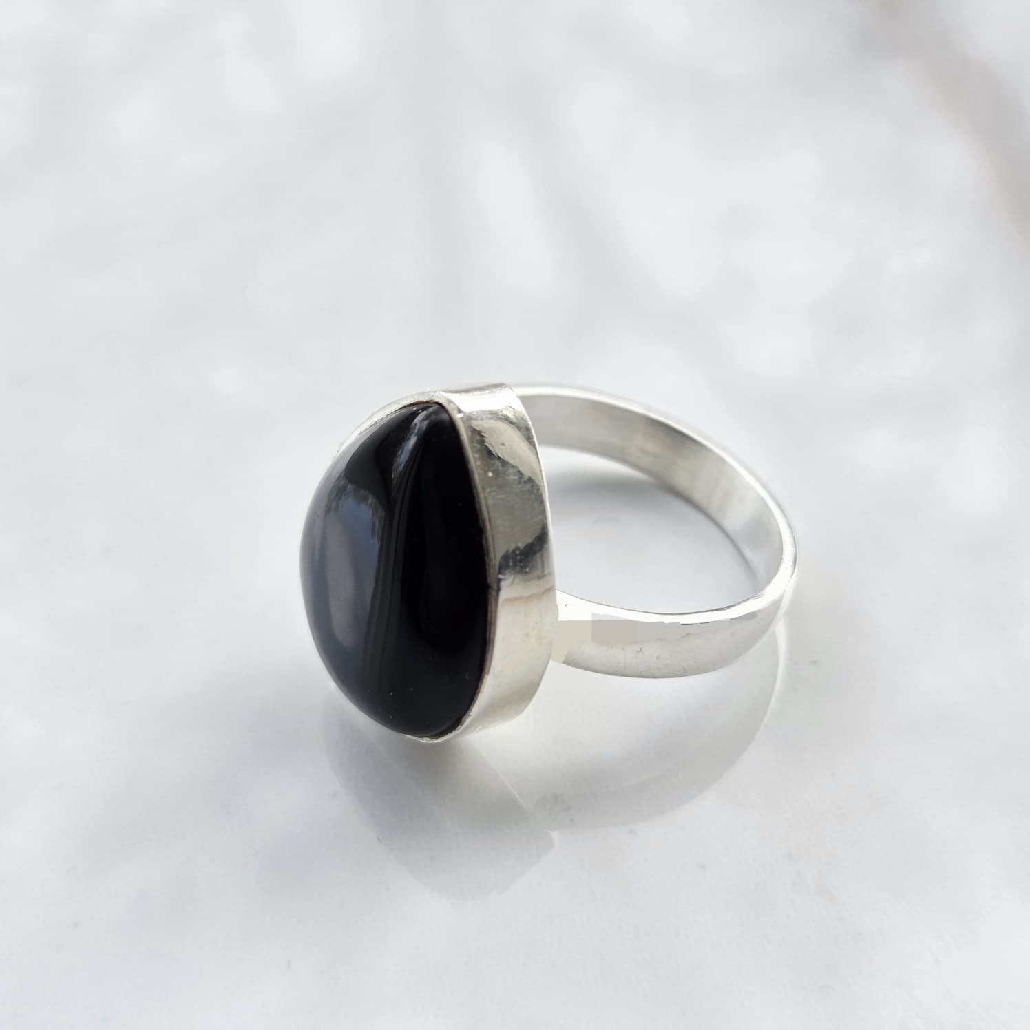 De vloeiende lijnen van de druppel slijpvorm geven de ring een zachte, luxe uitstraling, terwijl het 925 sterling zilver zorgt voor duurzaamheid en een hoogwaardige afwerking. Deze zwarte onyx ring van 925 zilver is perfect voor dagelijks gebruik of als stijlvolle toevoeging aan een avondlook.
