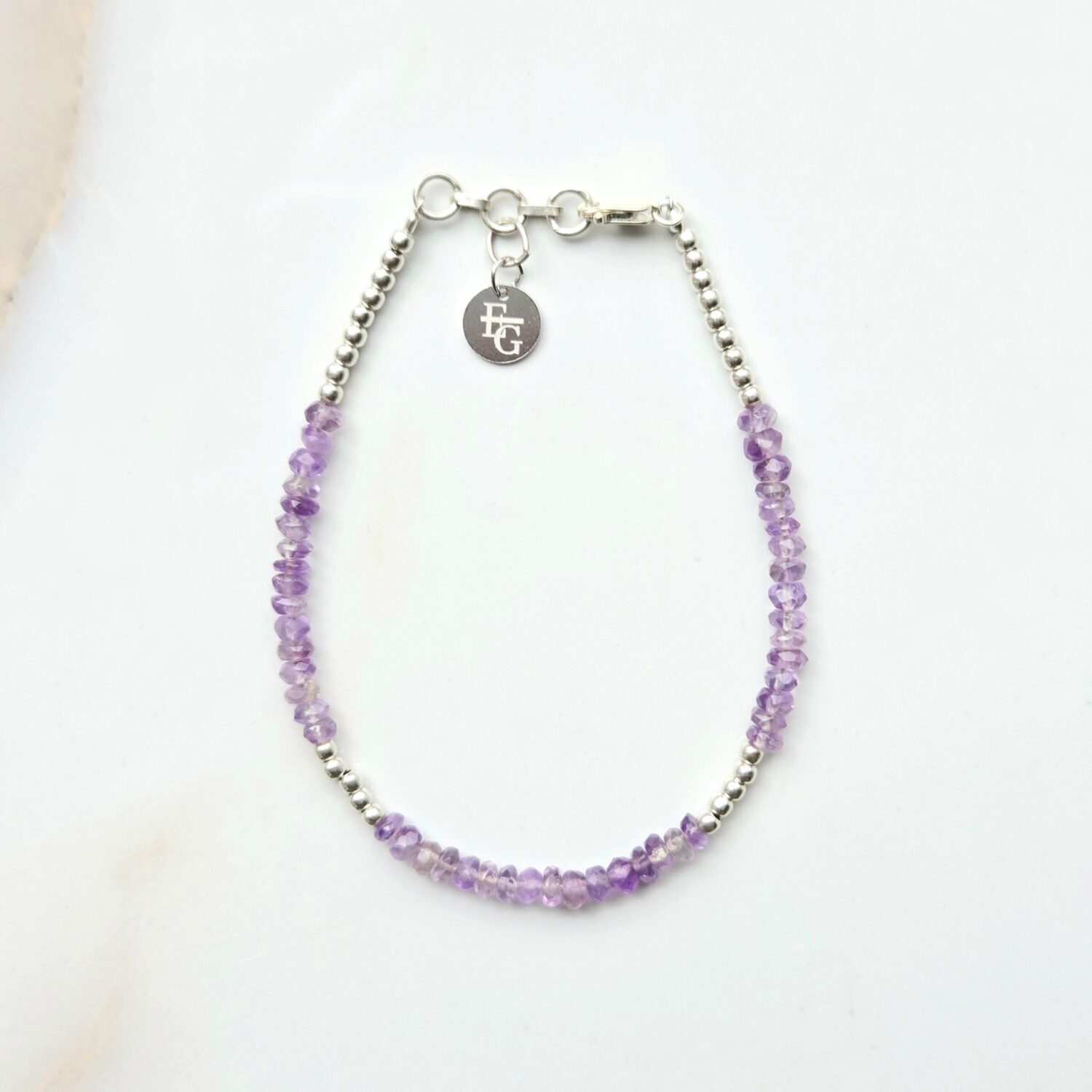 Breng stijl en sereniteit samen met de diepe paarse tinten van natuurlijke amethist. Deze 4 mm kralenarmband is handgeregen en afgewisseld met hoogwaardige 925 sterling zilveren bollen (S925) en een discrete S925 logo tag. Het minimalistische design maakt ’m ideaal voor dagelijks dragen of als verfijnde layer naast je andere armbanden.