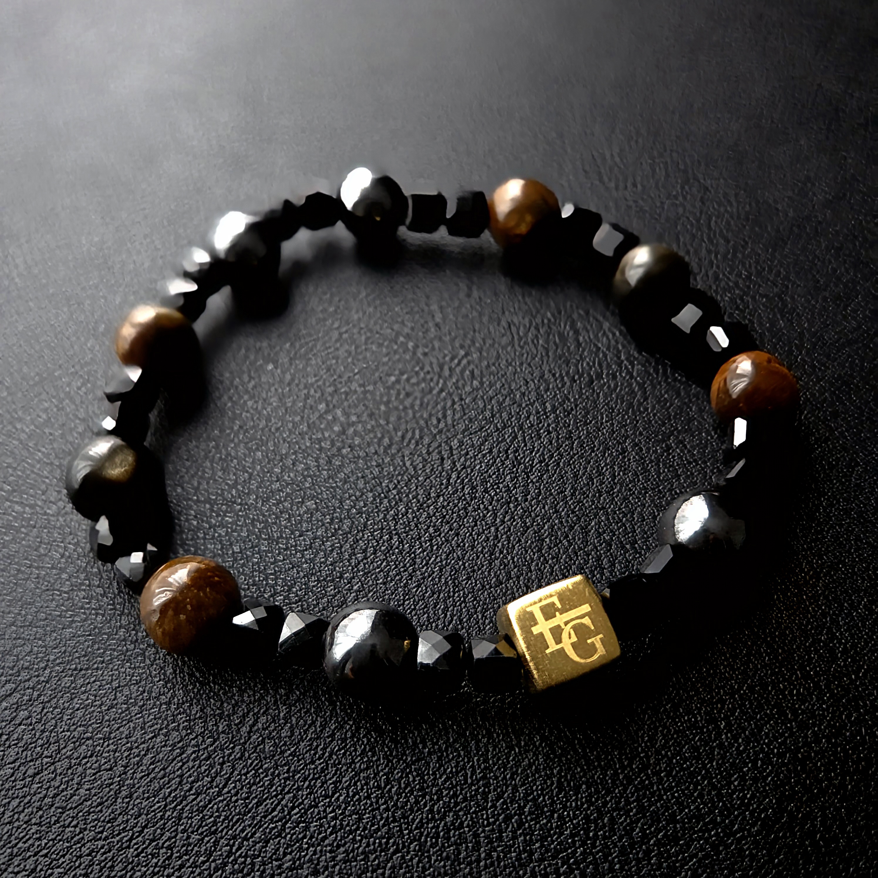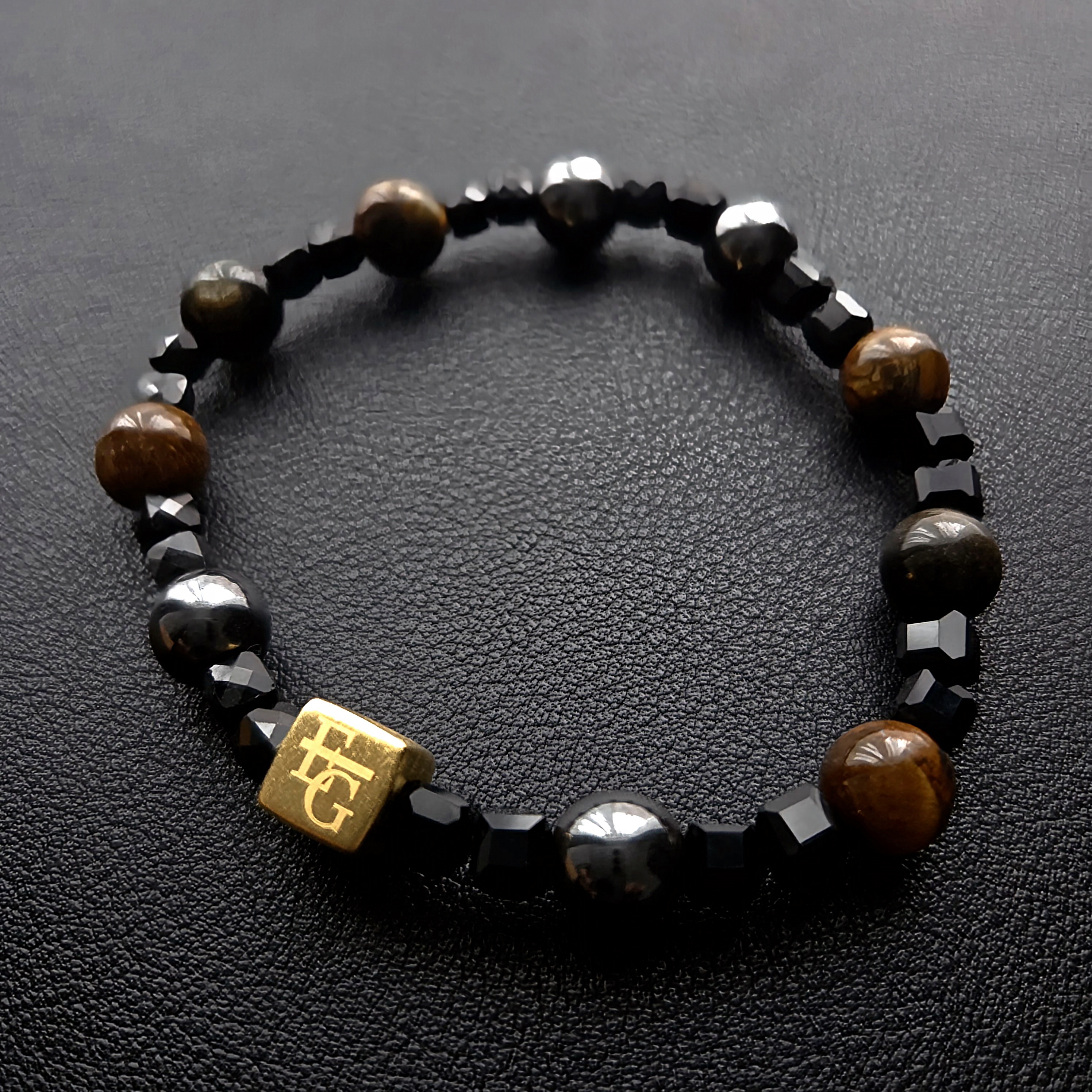 Set van natuurlijke edelstenen gericht op aarding, kracht en stabiliteit. Gemaakt met hematiet, zwarte toermalijn of obsidiaan en tijgeroog. Handgeregen met sterk elastiek en subtiel s925-detail.
