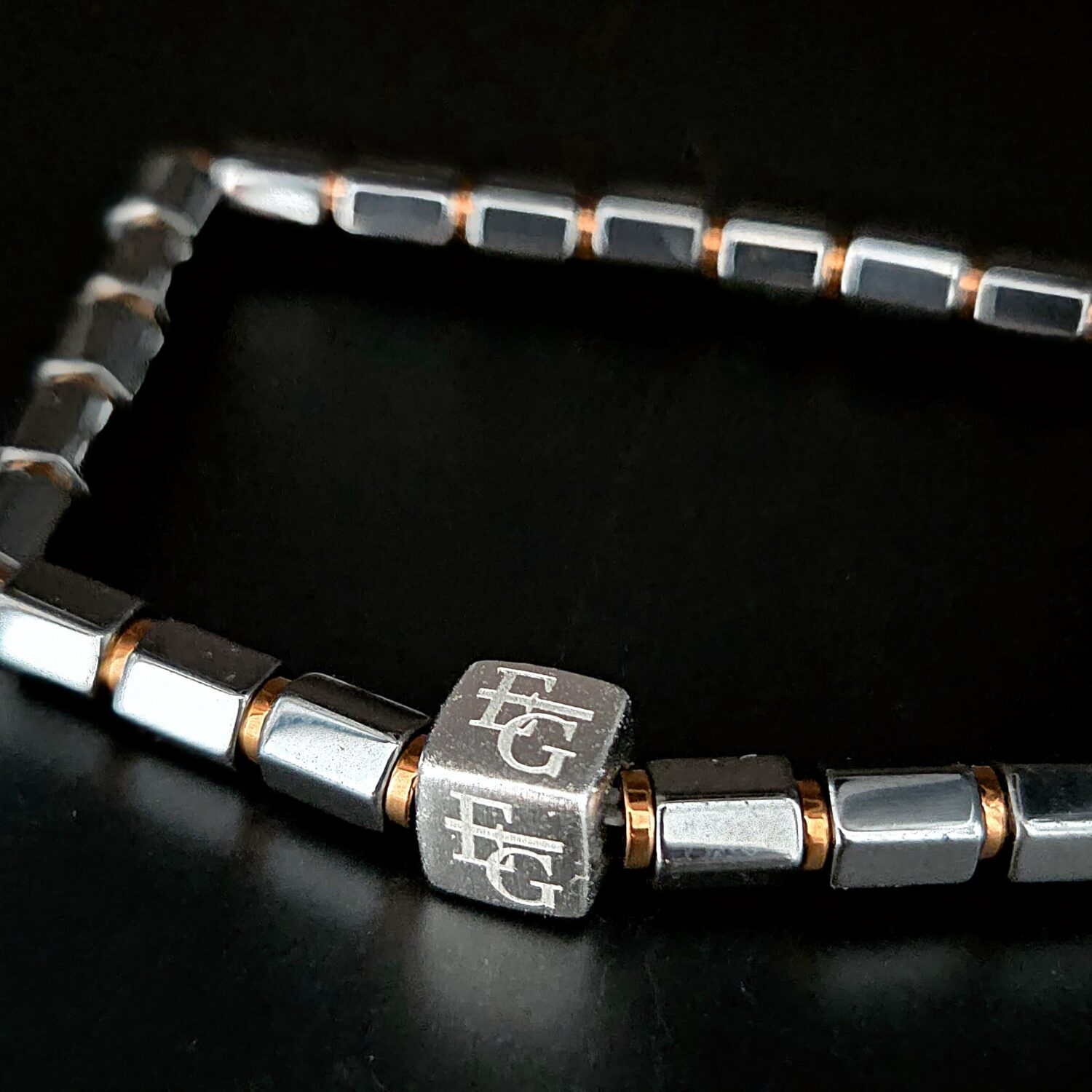 Tijdloze heren kralenarmband van natuurlijke stenen, volledig uitgevoerd in hematiet. De 6x6mm kralen geven een strak, modern en clean uiterlijk, terwijl het S925 logo blok zorgt voor een luxe afwerking.